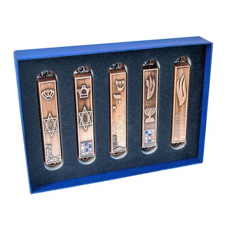 This is perfect set of 5 VINTAGE RED BRONZE Mezuzah's with 5 different symbols of zion: The western wall / the Menorah / star of David / Breastplate (Hoshen) Jerusalem panorama.