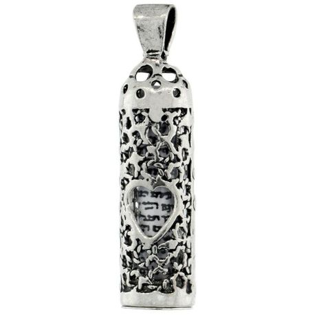 Silver 925 Mezuzah With Shema Israel Scroll Filigree Heart Pendant And Chain Hand Made Art Gift