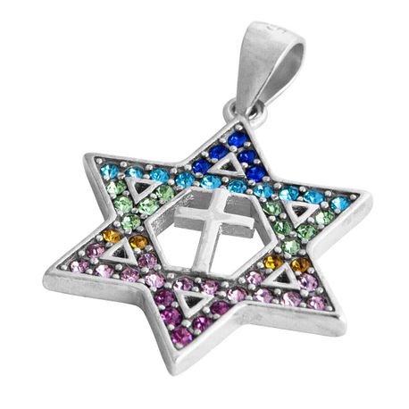 This is beautiful piece of art from the promised land: A sterling silver 925 Star of David & Cross pendant, inlayed with multi-color rainbow zircons