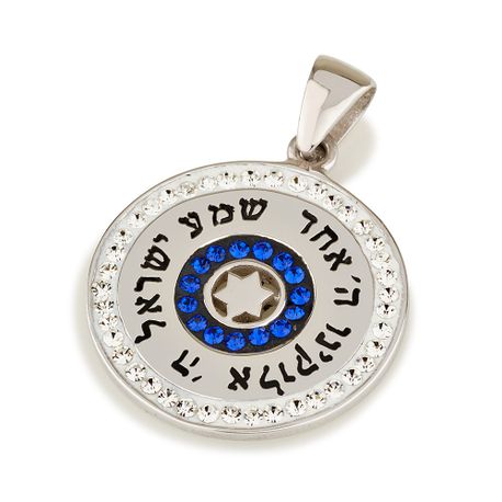 Silver 925 SHEMA ISRAEL Jewish Prayer With Star Of David & Blue And White Swarovski Stones Hebrew Verse Jewish Prayer Pendant Necklace