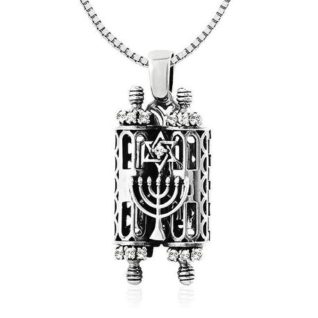 Silver 925 & Zircons Giant Massive Pendant Of OPENNING TORAH With Israel Menorah Pendant & Chain
